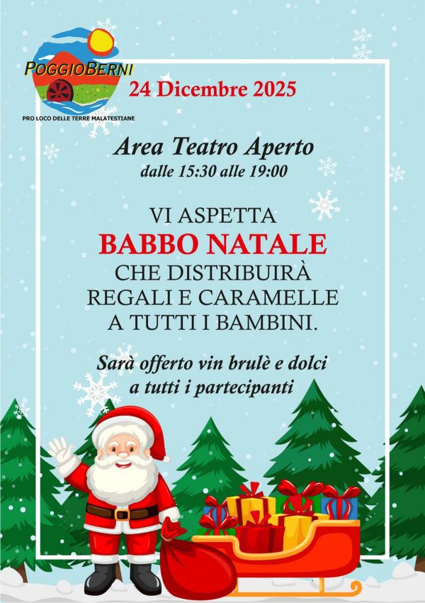 Babbo Natale vi aspetta al Teatro Aperto di Poggio Berni, dove distribuirà regali e caramelle a tutti i bambini.